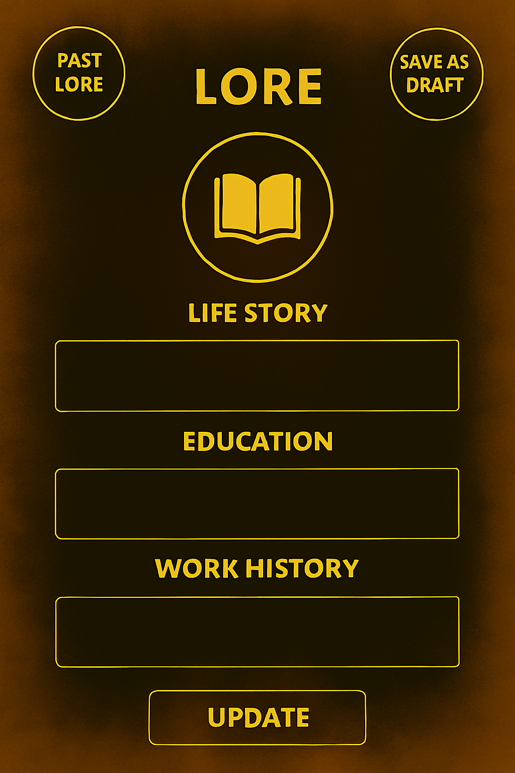The Lore tab invites you to share your personal journey—your experiences, education, work history, and goals. You’re encouraged to share as much as you’re comfortable with. Every detail you offer helps shape your character profile and makes the rest of RPGYou more accurate, meaningful, and tailored to you.