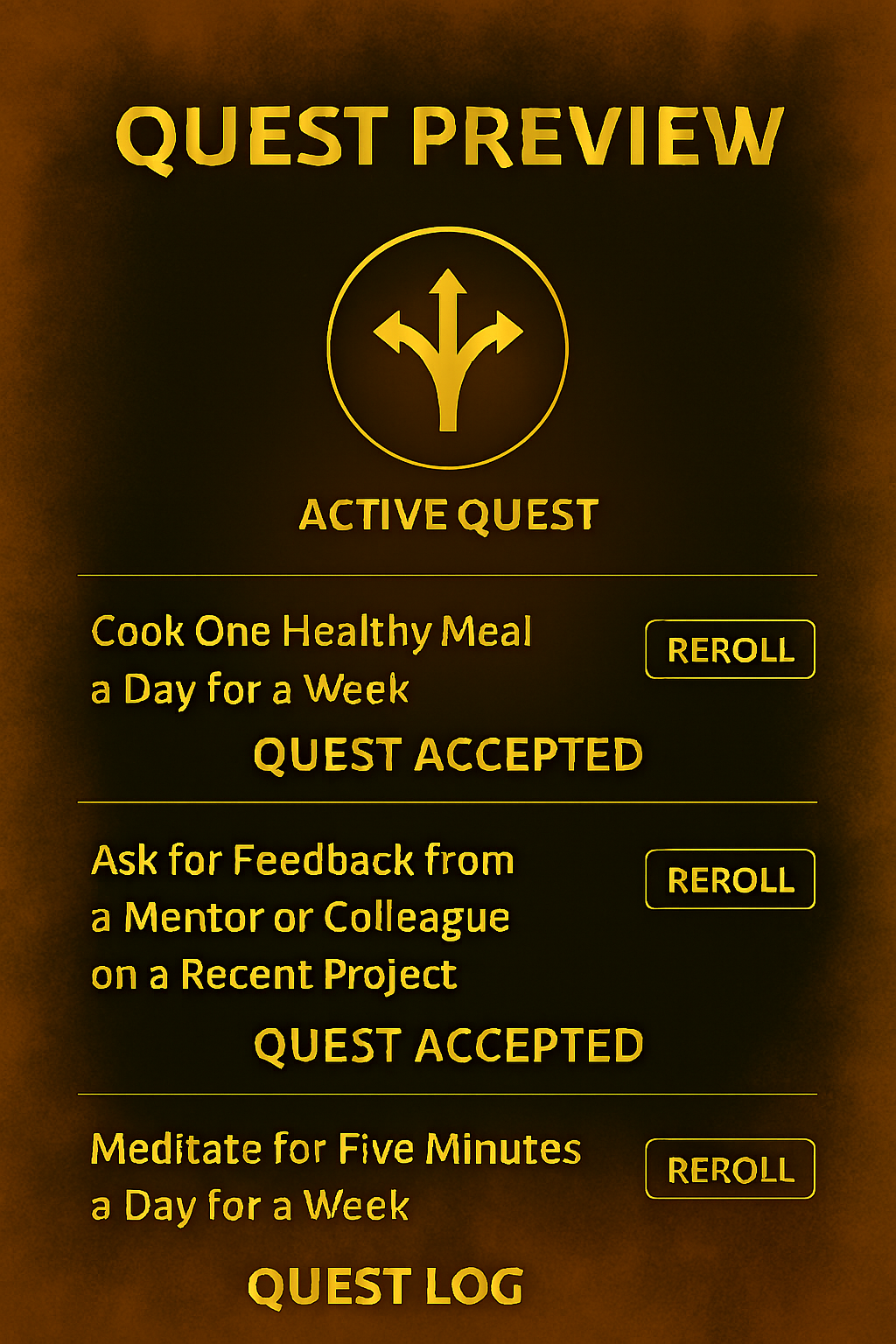 RPGYou’s quest engine is designed to be empathetic and adaptive. It takes into account your real-life situation—including any disabilities, chronic conditions, or limitations you choose to share. That means someone who is paralyzed will never receive a quest to go for a run, and someone navigating burnout won’t be asked to “hustle harder.” Every quest is context-aware, respectful, and tailored to what’s actually possible for you.