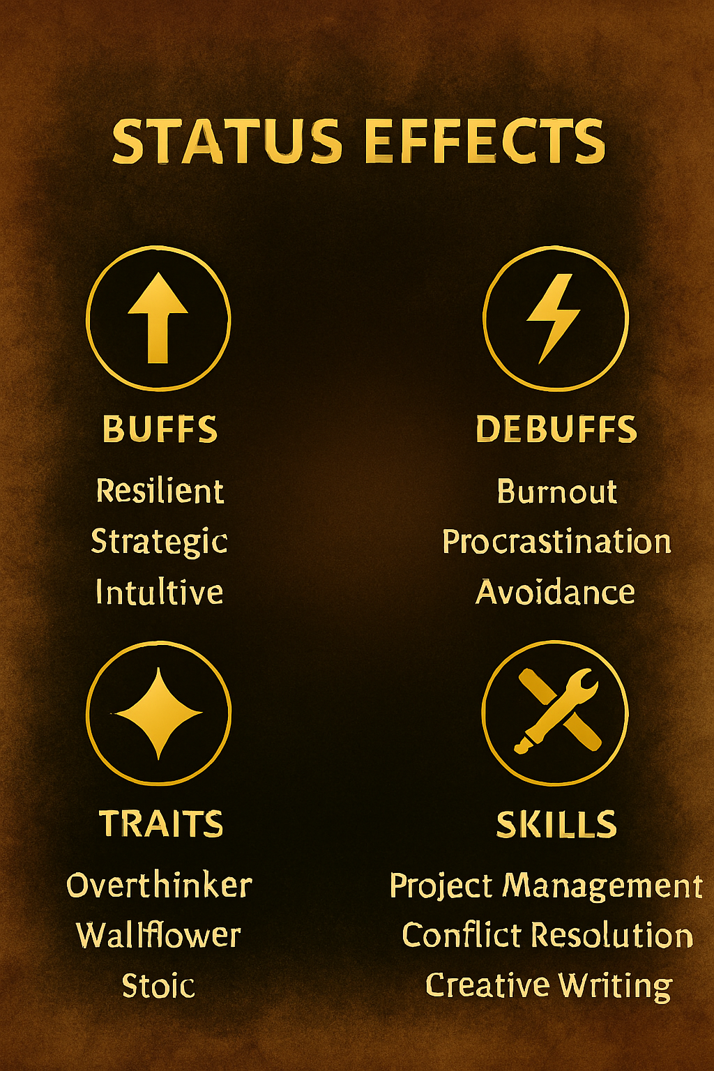 Together, these status effects form the living layer of your RPGYou character sheet—adapting as you grow, reflect, and complete quests.